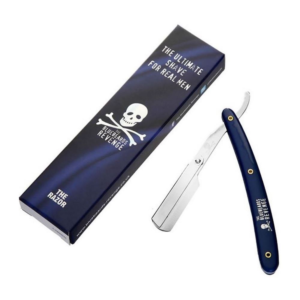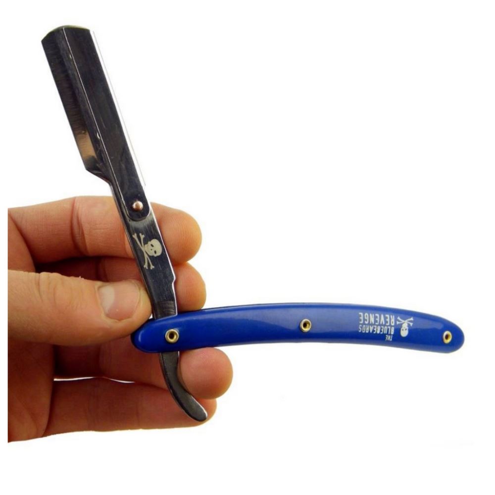 Comes in plastic slip case. Features distinctive The Bluebeards Revenge logo on the handle and the metal blade holder is laser etched with the Bluebeards skull!